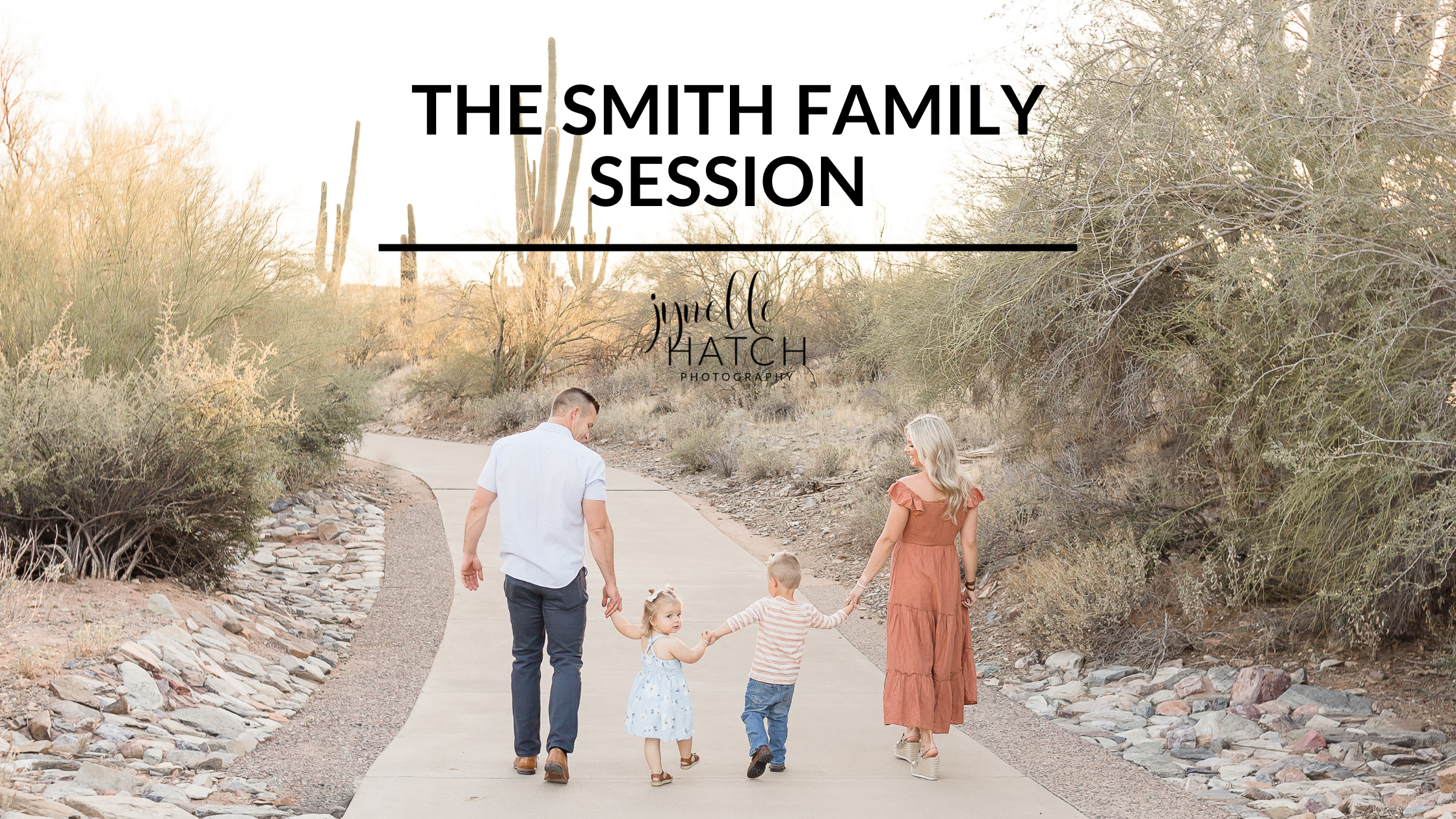 The Smith Family chose to book a mini session with me and it worked out so well with their little ones. Mini sessions are only 30 minutes in length and can be a great option if you have small children to help keep their attention. Ginny did an amazing job of coordinating her family outfits following my complimentary JHP Style Guide that she received prior to her session. I love the camel colored dress that she chose! Fun fact: So many of my other client’s also loved her dress that I added it to my JHP Client Closet after her session. Her family’s camel colored and blue toned outfits paired perfectly with the glowing desert backdrop at sunset.