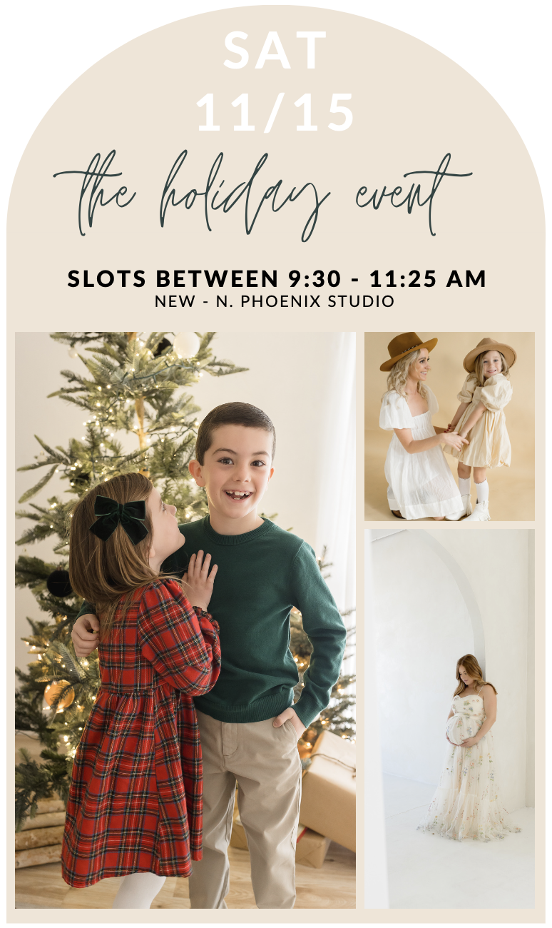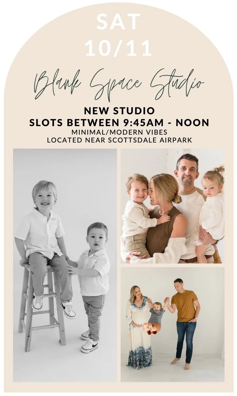Studio is located near Scottsdale Airpark. There will be options of minimal space, cozy space, paper backdrops and potential for holiday decor (not guaranteed). Exact holiday decor may vary from sample photos.